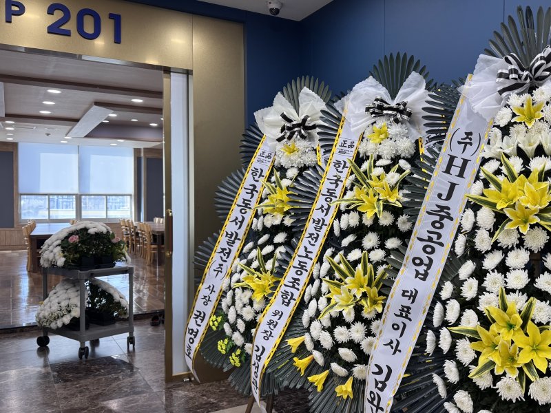 빈소 입구엔 사고 현장 공사 발주처인 동서발전과 원청인 HJ중공업이 보낸 화환이 나란히 놓여 있었다.
