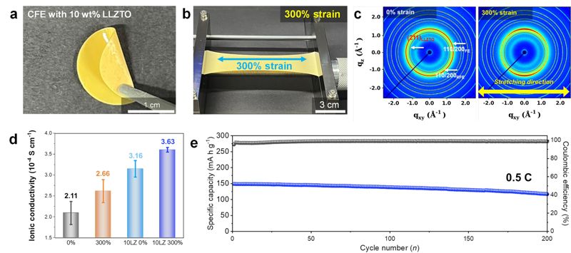 이 복합 전해질을 리튬금속-리튬인산철(LFP) 배터리에 적용하자 수명이 증가했다. 복합 전해질을 적용한 배터리는 200회 충·방전 후에도 초기 용량의 약 78%를 유지한 반면, 연신공정을 거치지 않은 순수 고분자 전해질은 200회 충·방전을 반복하자 용량이 초기의 55% 수준으로 감소했다.