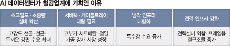 데이터센터는 일반 상업용 건물과 달리 서버와 장비의 하중을 견뎌내야 한다. 게다가 건물 프레임은 물론 서버랙(선반), 전력·냉각 장비, 보안 케이지 등에도 많은 철강이 들어간다. 특히 AI 데이터센터는 중앙처리장치(CPU)가 아닌 그래픽처리장치(GPU) 중심으로 더 고도의 전력 밀도, 냉각 방식, 네트워크를 갖춰야 한다는 점에서 더 많은 철강이 요구된다.