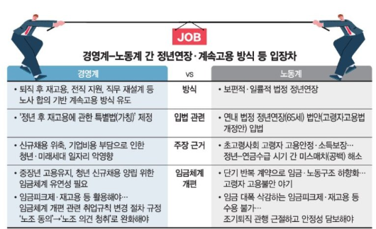 최근 논의에 불이 붙은 정년연장 여부 및 방식을 두고 노사 간 대치가 지속되고 있다. '유연성이 먼저냐, 안정성이 먼저냐'를 두고 양측의 지난한 의견충돌이 되풀이되는 양상이다. 경영계는 미래세대 일자리 부작용을 이유로 유연한 계속고용 방식을, 노동계는 고령자 고용·소득 불안 방지를 위한 보편적·일률적 법정 정년연장을 주장하는 등 입장이 확연하게 엇갈린다.