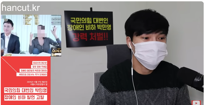 이어 유튜브 채널 진행자가 김 의원에 대해 “김예지는 장애인인 것을 천운으로 알아야 한다”, “장애인이고 XX(여성 비하 표현)이니까 이만큼만 하는 거지 장애 없는 남자였으면 진짜 뒤X다”는 등 욕설을 섞은 막말을 할 때도 박 대변인은 별다른 반응 없이 웃기만 했다.
