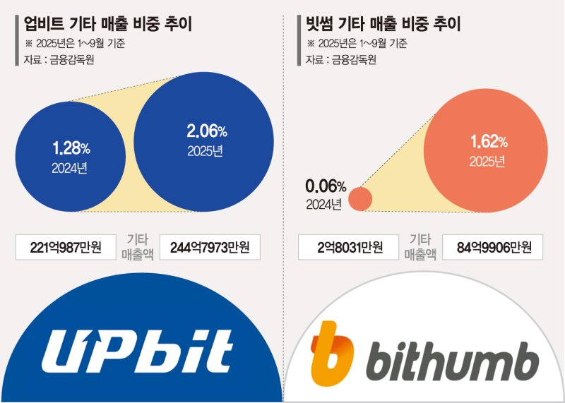 이에 거래소들은 사업 다각화에 시동을 걸고 있다. 올해 3·4분기까지의 두나무의 전체 매출 중 거래 수수료를 제외한 기타 부문 매출 비중은 2.06%로, 지난해 1.28%보다 늘었다. 빗썸의 올해 3·4분기까지 기타 부문 매출 비중은 1.62%로, 최근 2년간 0.06% 수준을 보인 것과 비교해 큰 폭으로 증가했다.