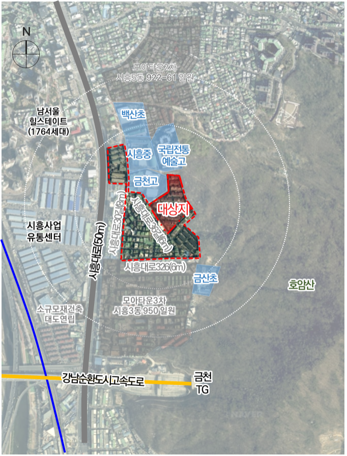 먼저 금천구 시흥3동 1005번지 일대는 7개동 규모로 공동주택 총 473가구(임대 95가구 포함)를 공급할 예정이다. 전체 가구 수의 20% 이상을 임대주택으로 건설해, 용적률 완화로 사업성을 높였다. 노후 건축물이 밀집된 구릉지형으로 재개발이 어려웠던 이 지역은 이번 심의를 통과해 인접 모아주택(금천구 시흥동 943 일대)과 동시 개발이 가능하게 됐다.