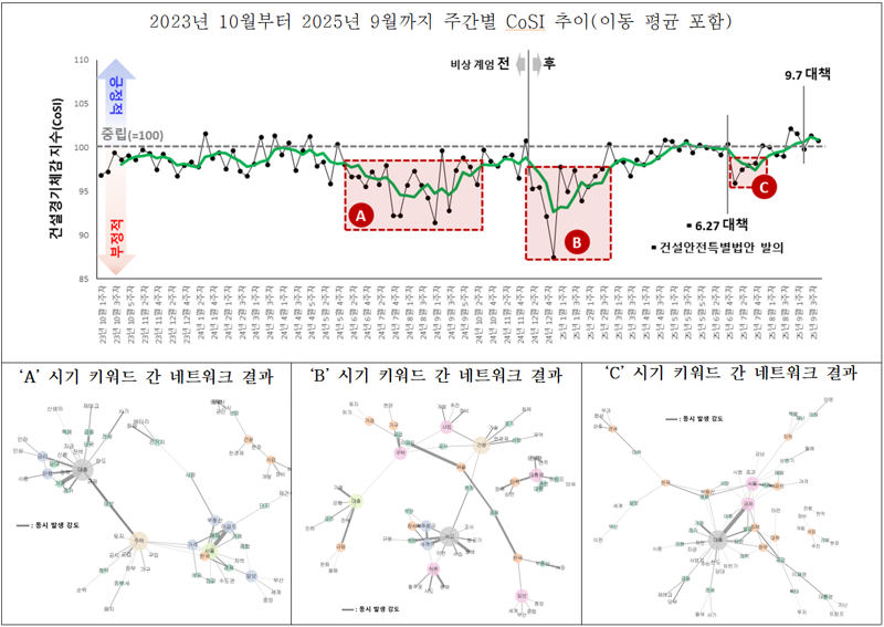 연구원은 언론 기사에서 추출한 약 2300만개 단어 중 건설경기와 연관성이 높은 2080개 단어를 선별해 단어별 체감 점수를 부여하고, 빈도와 네트워크 구조를 분석해 CoSI를 산출했다고 밝혔다. 금융, 주택, 정책, 기술 등 다양한 요인이 결합된 복합형 구조다.