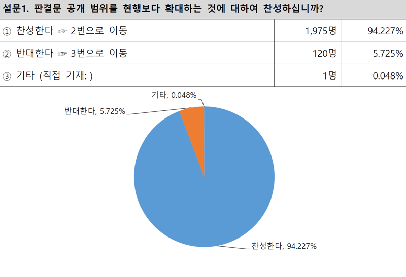 비변호사와 변호사 간 판결문 공개 범위를 달리하자는 제안에는 55.9%가 찬성했다. 영리 목적의 대량 수집을 제재해야 한다는 의견(36.5%)이 가장 많았고, 공개 방식으로는 '변호사에게만 판결문을 공개하고 일반 국민에게는 비공개'(37.6%)가 가장 높은 비율을 차지했다.