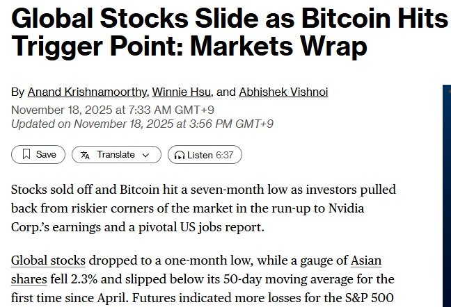 특히 비트코인이 오후 들어 9만달러가 붕괴하는 등 자유낙하하자 글로벌 증시가 일제히 충격받고 있다고 블룸버그는 전했다.