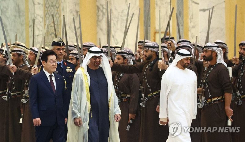 이 대통령 탑승 차량이 가는 길 양쪽으로 태극기와 UAE 국기가 교차로 게양됐으며, 기마병·낙타병 의장대가 도열해 이 대통령을 반겼다. 귀한 손님을 맞이할 때 선보이는 UAE 전통 공연 '알 아이알라'도 열렸다.