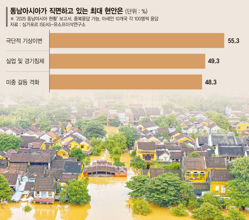 ASEAN 국민들도 기후위기를 더 이상 정치적 구호가 아닌 실제적 위협으로 느끼고 있다. 앞서 지난 4월 아세안 지역의 대표적 싱크탱크인 싱가포르 ISEAS-유소프이삭연구소는 '2025 동남아시아 현황' 보고서에서 주요 아세안 국가들이 올해 당면한 최대 현안으로 경제보다 기후위기를 꼽았다.