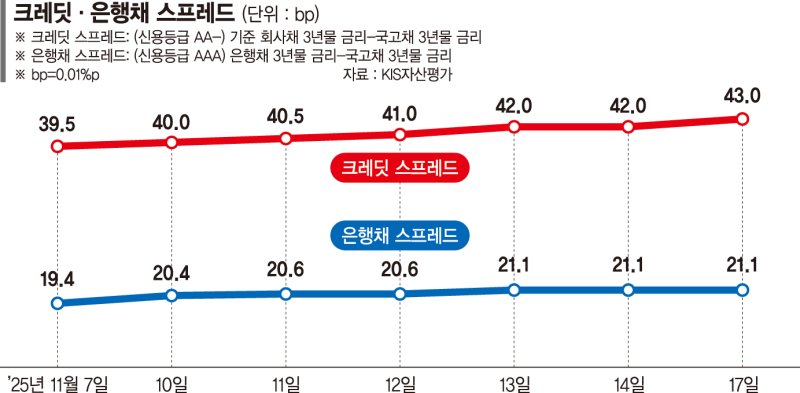 18일 KIS자산평가에 따르면 회사채 투자심리를 가늠할 수 있는 크레딧 스프레드(신용등급 AA- 기준 회사채 3년물 금리-국고채 3년물 금리)는 지난 17일 기준 43.0bp(1bp=0.01%p)를 가리키고 있다. 지난 7일 39.5bp까지 축소됐던 스프레드가 확대 추세로 전환됐다는 평가다.