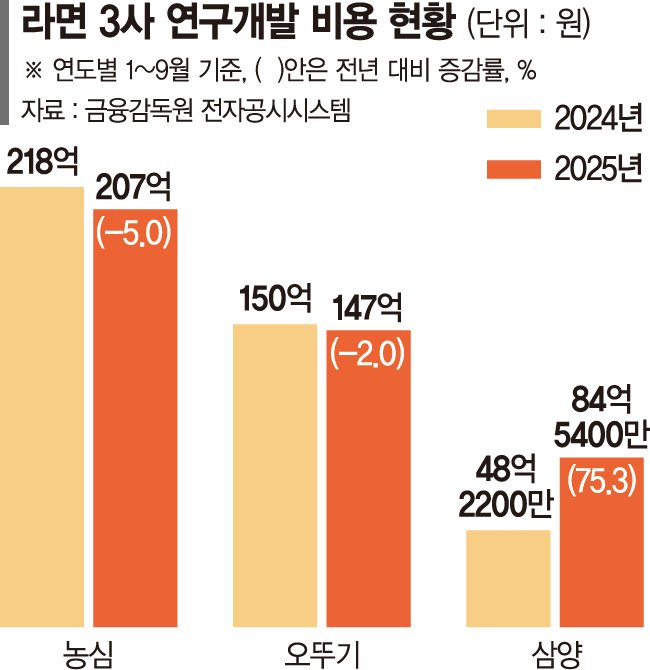 한편, 라면 경쟁사들의 연구개발 비용은 큰 변화가 없는 것으로 나타났다. 농심의 올 1~9월 R&D 비용은 207억원으로 지난해 같은 기간(218억원) 대비 11억원(5.0%) 감소했고, 오뚜기 역시 지난해 3·4분기까지 연구개발로 150억원을 투자했지만 올해는 이보다 3억원(2.0%) 감소한 147억원으로 집계됐다. 이는 농심과 오뚜기는 삼양식품과 달리 매출 대부분이 내수 시장에 나오기 때문이다.