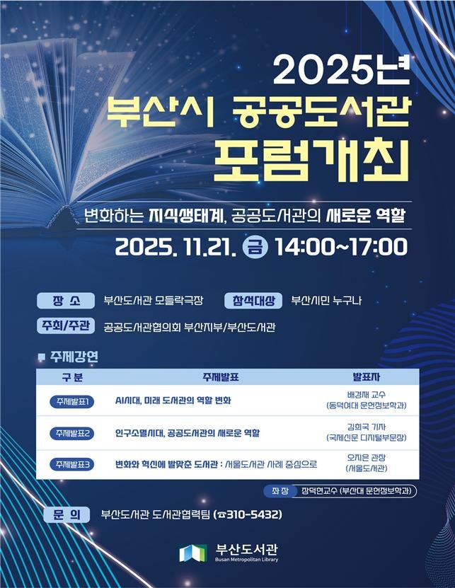 포럼은 '변화하는 지식생태계, 공공도서관의 새로운 역할'을 주제로, 인공지능 시대, 인구 변화 등 사회적 변화 속에서 공공도서관이 시민과 함께 성장하기 위한 미래 전략을 논의한다.
