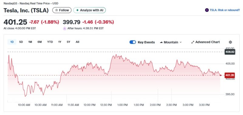 18일(현지 시각) 뉴욕증시에서 테슬라는 1.88% 하락한 401.25달러를 기록했다. 이로써 시총도 1조3340억달러로 줄었다.