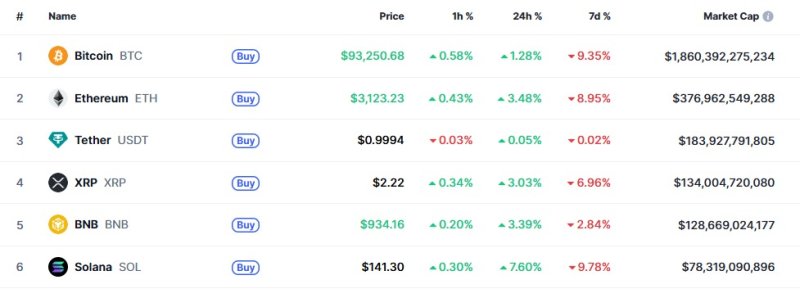 19일 오전 7시 40분 현재 글로벌 코인 시황 중계사이트 코인마켓캡에서 비트코인은 24시간 전보다 1.28% 상승한 9만3250달러를 기록하고 있다. 비트코인이 9만3000달러선을 회복한 것.