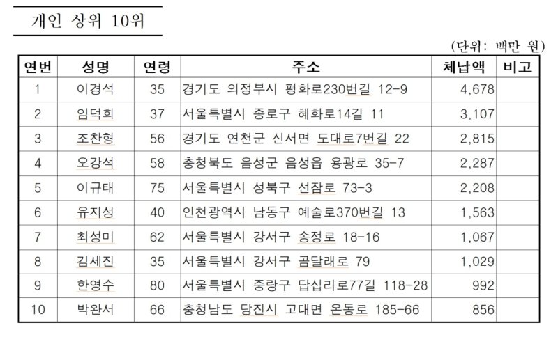 예고기간에 체납 세금을 납부하거나 이의신청·소송 등 불복 청구 중인 경우 등 246명은 공개 대상에서 제외했다.