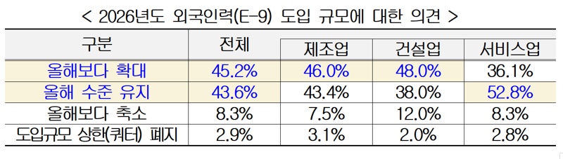 19일 한국경영자총협회가 300인 미만 제조·건설·서비스업 312개사를 대상으로 '외국인 근로자 활용 현황 및 정책 인식 조사'를 실시한 결과, 응답자 45.2%는 내년 외국인 근로자(체류자격 E-9) 도입 규모가 올해보다 늘려야 한다고 답했다. 올해 외국인 근로자(E-9) 도입 규모는 13만명이다.