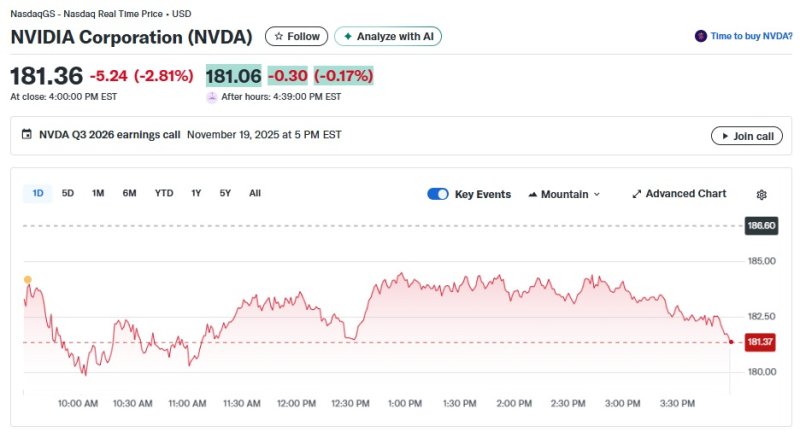 그러나 시장은 여전히 AI 버블을 우려하고 있다. 실적 발표 전일인 18일 뉴욕증시에서 엔비디아는 2.81% 급락한 181.36달러를 기록했다.