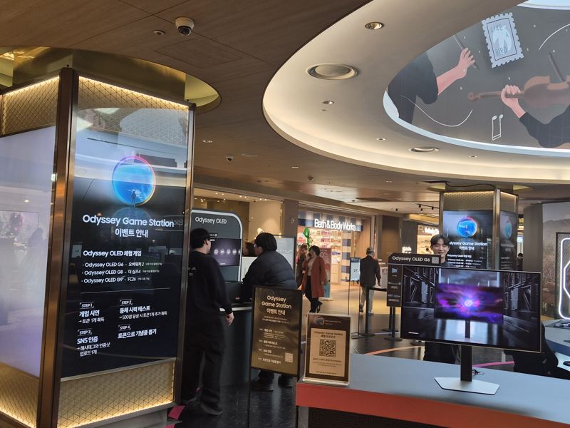 19일 서울 강남구 파르나스몰 입구에 마련된 삼성전자의 팝업스토어 '오디세이 게임 스테이션'. 체험관 입구는 삼성디스플레이의 퀀텀닷 유기발광다이오드(QD-OLED) 패널이 적용된 '오디세이 OLED G9'를 직접 체험하려는 관람객들로 북적였다. 방문객들은 큐알(QR)코드를 스캔해 제품 정보를 살펴본 뒤 고사양 게임을 직접 실행해보며 고화질 OLED 화면이 주는 몰입감을 경험했다.
