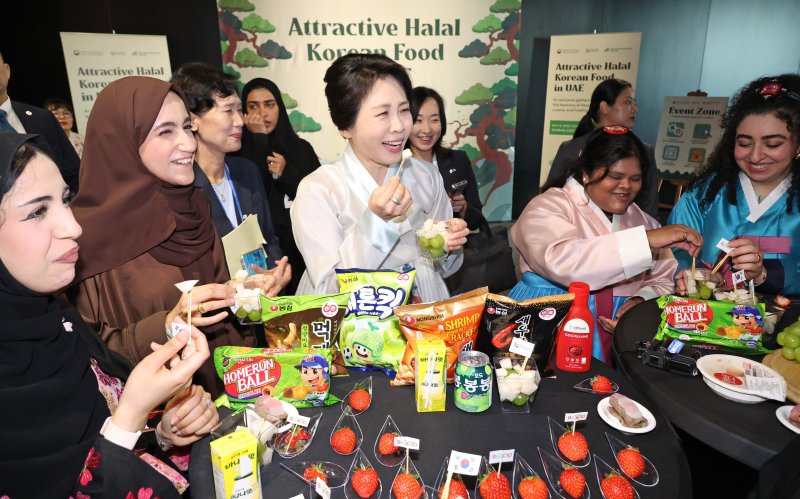 【아부다비(UAE)=성석우 기자】김혜경 여사가 19일(현지시간) 아랍에미리트(UAE) 아부다비 한국문화원에서 열린 '할랄 인증 K-푸드 홍보 행사'에서 스마트팜 딸기·한우·라면 등 한국 농식품을 직접 시식하며 한-UAE 식품 협력 확대 의지를 강조했다.