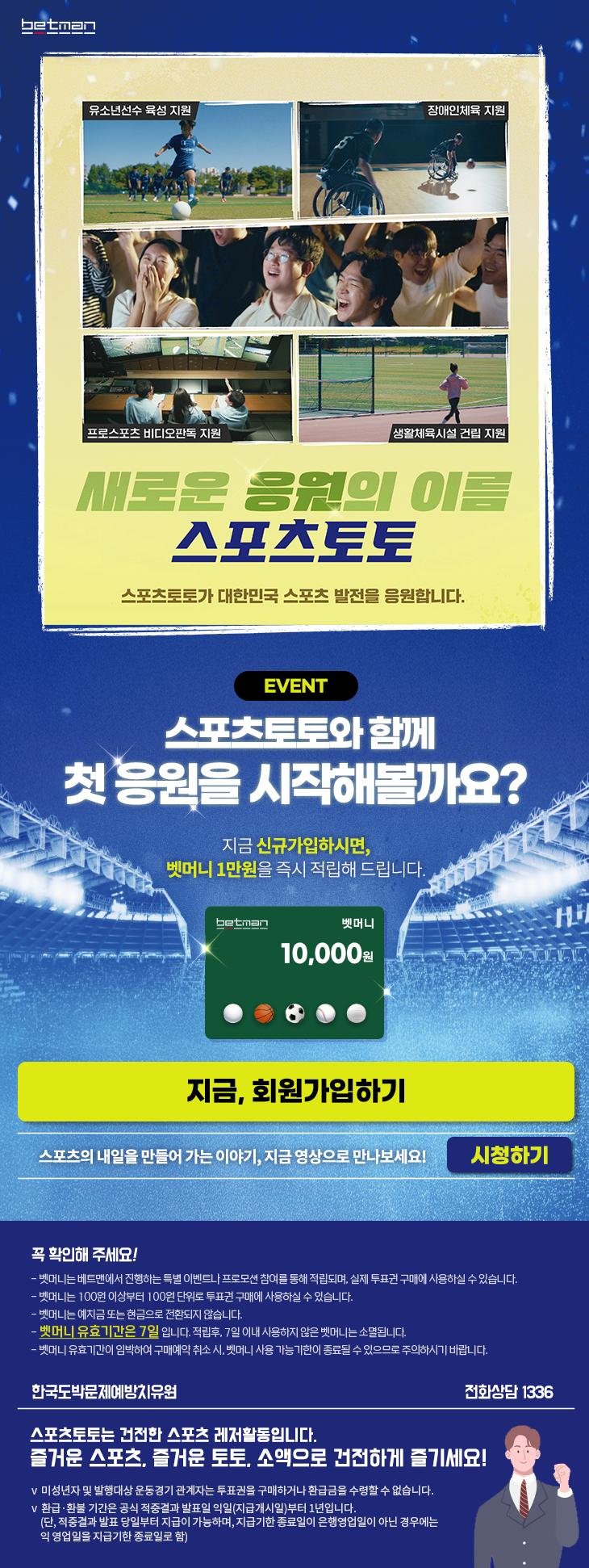 '스포츠토토와 함께 첫 응원을 시작해볼까요?'라는 제목으로 진행되는 이번 이벤트는 스포츠토토를 처음 이용하는 회원에게 가입과 동시에 벳머니 1만원을 자동 지급하는 것이 핵심이다. 참여 기간은 오는 22일까지며, 별도의 복잡한 조건 없이 공식 인터넷 발매사이트 '베트맨'에 회원가입만 하면 혜택을 받을 수 있다.