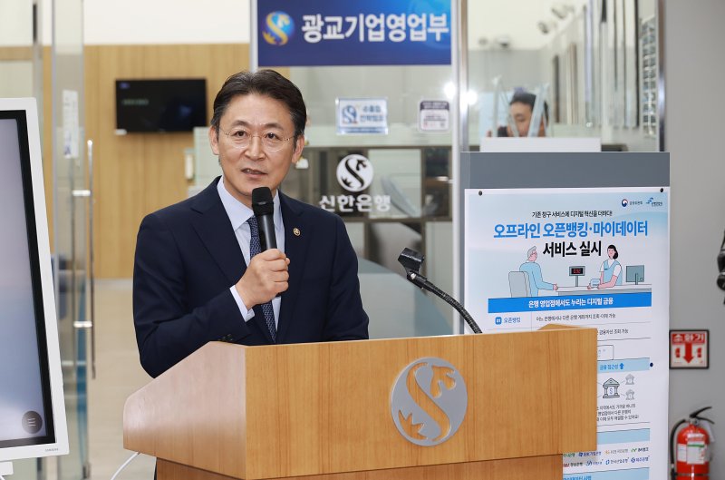 권대영 금융위원회 부위원장과 정상혁 신한은행장 등은 19일 서울 중구 신한은행 광교영업부 영업점에서 '오픈뱅킹·마이데이터 서비스 오프라인 실시' 상황을 점검했다. 이날부터 온라인에서만 제공되던 오픈뱅킹·마이데이터 서비스가 은행 창구까지 확대된다.