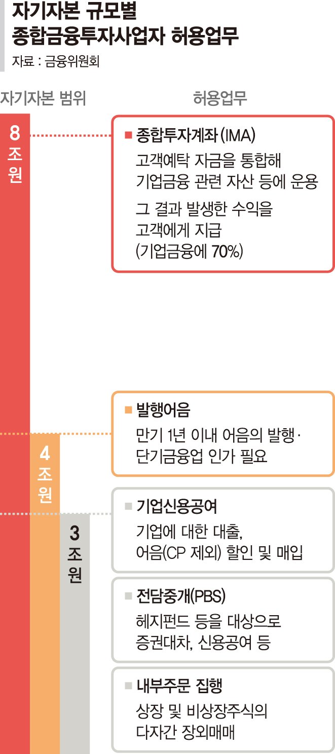 IMA 사업자는 자기자본의 최대 300%까지 자금을 조달할 수 있다. 기존 발행어음 한도(자기자본의 200%)에 IMA 조달분 100%를 추가해 운용하는 구조다. 한국투자증권은 올 3·4분기 말 현재 별도기준 자기자본이 12조219억원이다. 발행어음 한도(24조원)와 IMA(12조원)를 합쳐 최대 36조원까지 자금을 모을 수 있는 셈이다.