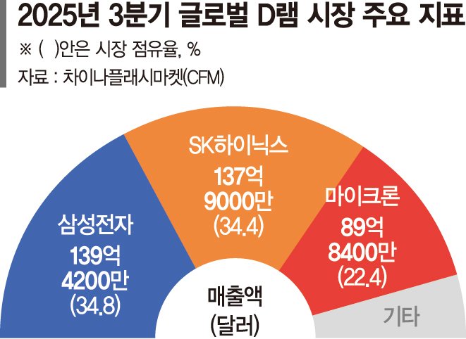 19일 시장조사업체 차이나플래시마켓(CFM)에 따르면, 삼성전자의 3·4분기 D램 시장 점유율은 34.8%로, SK하이닉스(34.4%)를 소폭 앞서며 매출 기준 1위를 회복했다. 삼성전자는 지난 1·4분기 SK하이닉스에 D램 선두 자리를 내줬지만, 두개 분기 만에 다시 정상에 올랐다. SK하이닉스는 같은 기간 137억9000만달러의 D램 매출을 기록해 전 분기 대비 12.4% 성장했다.