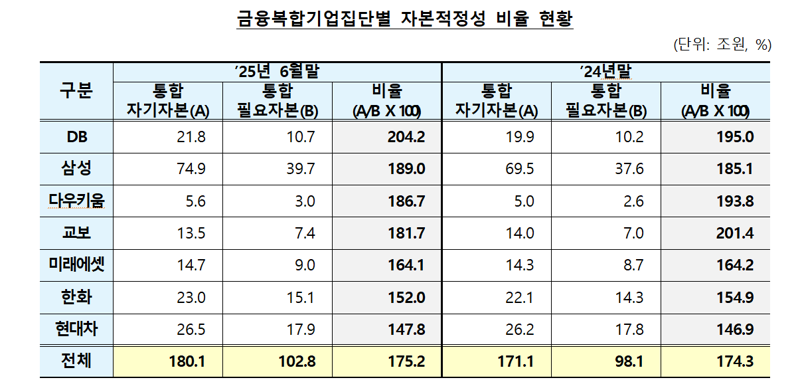 금융감독원이 20일 발표한 '2025년 6월말 금융복합기업집단 자본적정성 비율'에 따르면 교보·DB·다우키움·삼성·미래에셋·한화·현대차 등 7개 금융복합기업집단의 평균 자본적정성 비율은 175.2%로 집계됐다. 지난해 말(174.3%) 대비 0.9%포인트(p) 상승했다.