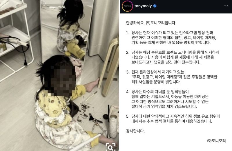 [파이낸셜뉴스] 어린아이 얼굴에 아이라이너를 바르는 영상이 온라인상에 확산돼 화제가 된 가운데 해당 영상으로 제품을 홍보했다는 논란에 휩싸인 화장품 기업 토니모리가 "명백한 허위사실"이라며 전면 부인했다.