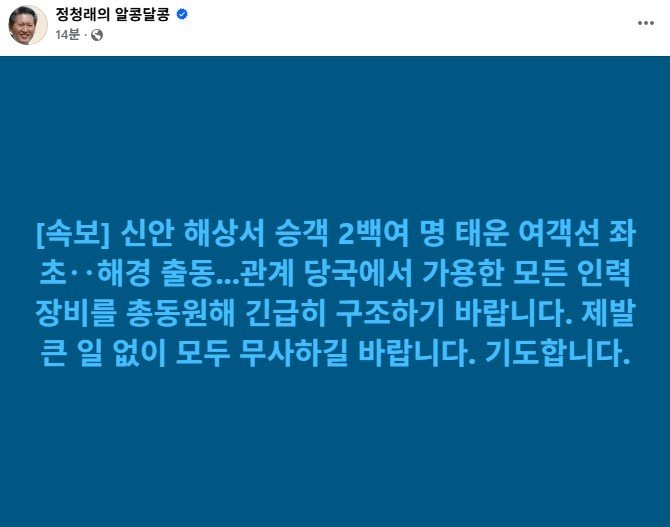 정 대표는 19일 오후 9시 10분쯤 자신의 페이스북에 "신안 해상서 승객 200여 명 태운 여객선 좌초, 관계 당국에서 가용한 모든 인력 장비를 총동원해 긴급히 구조하기 바랍니다. 제발 큰 일 없이 무사하길 바랍니다"고 남겼다.