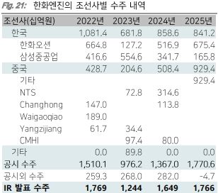 다올투자증권은 "2분기에 이연된 엔진 5대로 35대 가량을 남품해 매출이 많았던 기저로 전분기 대비 매출이 23% 감소했다. 영업이익률은 8.9%로 0.2%p 개선됐다. 중국 엔진은 2분기 1151억원에서 3분기 504억원 감소했는데 수익성 개선이 이뤄졌다"며 "4분기부터는 수익성 개선을 확인할 것이다. HD현대마린엔진이 2분기부터 2024년 초대박 고가엔진이 납품되고, 3분기에 50%를 넘겼는데 한화엔진의 2024년 물량은 4분기에 첫 납품이 시작되고, 내년 1분기에 크게 늘 것"으로 기대했다.