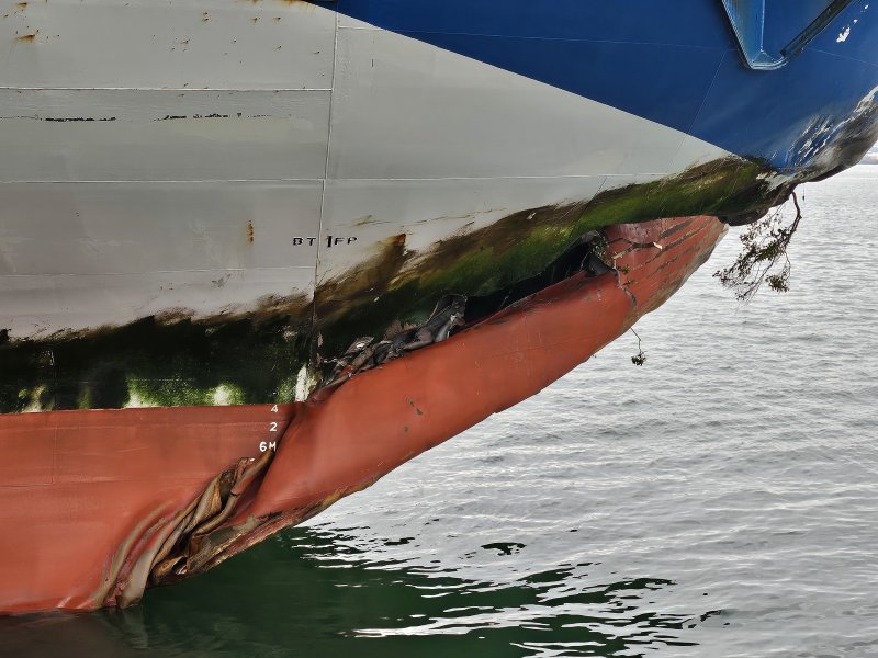 찌그러진 부위에는 나무 잔가지들이 사이사이 박혀 있었으며, 암초에 부딪힌 부위는 검은색과 녹색 얼룩이 짙게 남아 있었다.