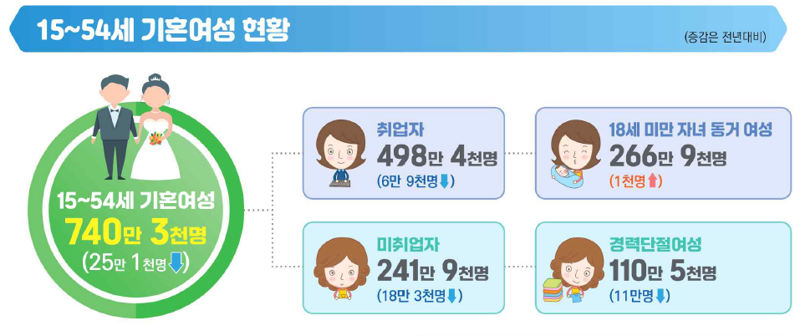 반면, 직장을 다니다 그만둔 경력단절여성의 비율은 감소했다. 15~54세 기혼 여성 중 경력단절여성은 110만5000명으로 전년보다 11만명 줄었다. 전체 기혼 여성에서 차지하는 비중도 전년 대비 1.0%p 낮아진 14.9%를 기록했다. 이는 조사가 시작된 2014년 이후 최저다.