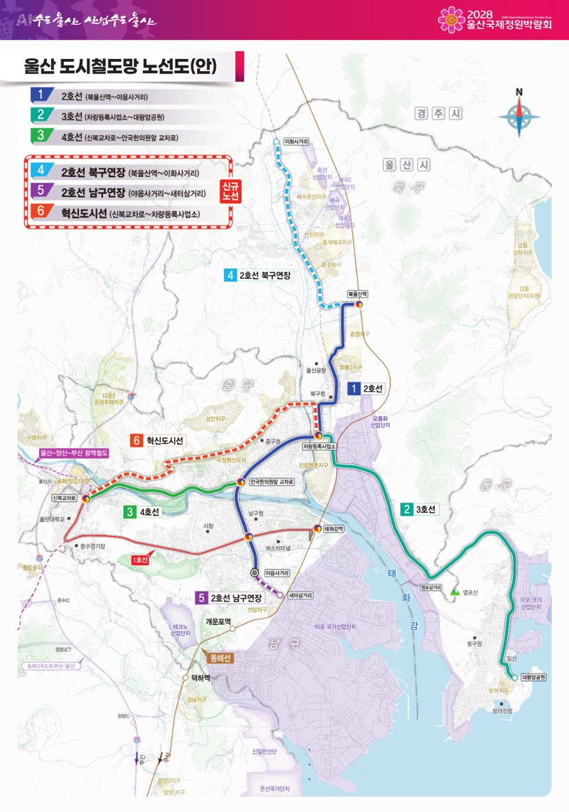 신규 노선으로는 △2호선 북구연장(북울산역~이화사거리) △2호선 남구연장(야음사거리~새터삼거리) △중구 혁신도시선(신복교차로~종가로~진장유통단지)이 포함된다.