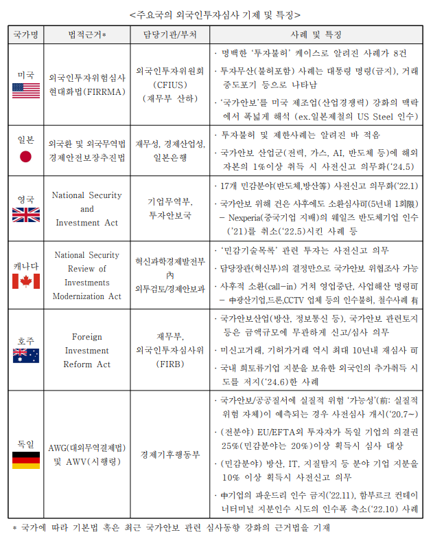 무역협회에 따르면 영국·캐나다 등 주요국은 이미 허가한 심사라도 국가안보상 긴급하고 중대한 경우 재심사를 통해 지분매각 등 강력한 조처를 할 수 있는 제도를 마련하고 있다. 실제 2021년 중국계가 다수 지분을 보유한 네덜란드 기업 넥스페리아가 웨일즈 반도체 기업 뉴포트웨이퍼를 인수했지만, 영국 정부는 이듬해 넥스페리아를 사후 소환해 지분 86%를 처분할 것을 명령한 바 있다.