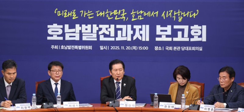 정 대표는 이날 오후 국회에서 열린 호남발전과제 보고회에서 "이재명 정부 첫 예산이라고 볼 수 있는데 내년도 예산 편성을 보니 광주는 3조6616억원, 전남은 9조4183억원에 R&D 예산으로 236억원, 전북은 9조4585억원으로 세 지역의 정부 예산이 역대 최대로 편성됐다. 최대 규모 예산"이라며 이같이 말했다.
