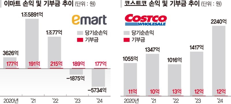 이마트는 당기순이익 대비 매년 5~7% 가량을 기부금으로 사용하는 것으로 파악됐다. 2023년(-1875억원), 2024년(-5734억원)에는 2년 연속 수천억원의 순손실을 기록하고도 100억원 후반대 기부금 지출을 유지했다.