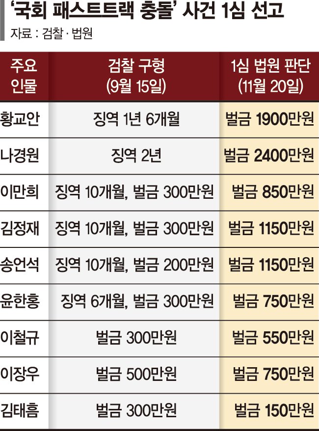 20일 정치권에 따르면 국민의힘은 패스트트랙 사건에 연루된 의원 6명에 대해 전원 벌금형이 선고되면서 의원직 상실이라는 악재는 면하게 됐다.