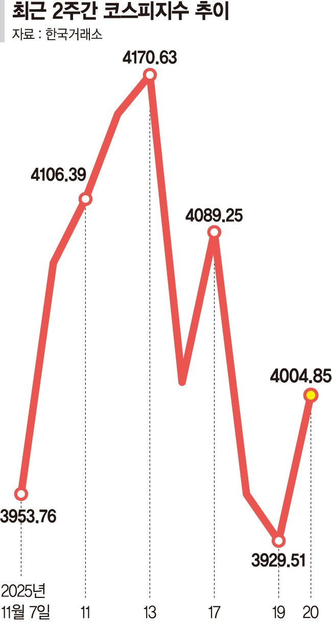20일 한국거래소에 따르면 코스피는 전 거래일보다 75.34p(1.92%) 오른 4004.85에 거래를 마쳤다. 최근 순매도를 이어오던 기관과 외국인은 이날 각각 8435억원, 6052억원을 사들이며 지수를 끌어올렸다.