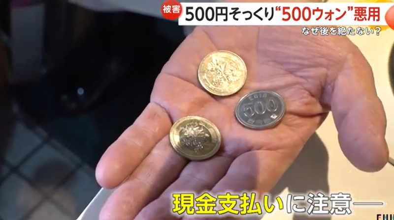 지난 20일 일본 현지 방송인 후지뉴스네트워크(FNN)는 '500엔처럼 생긴 10분의 1 가치의 500원 피해가 잇따르고 있다'는 제목으로 최근 음식점·주유소 등에서 피해를 입는 자영업자들의 소식을 전했다.