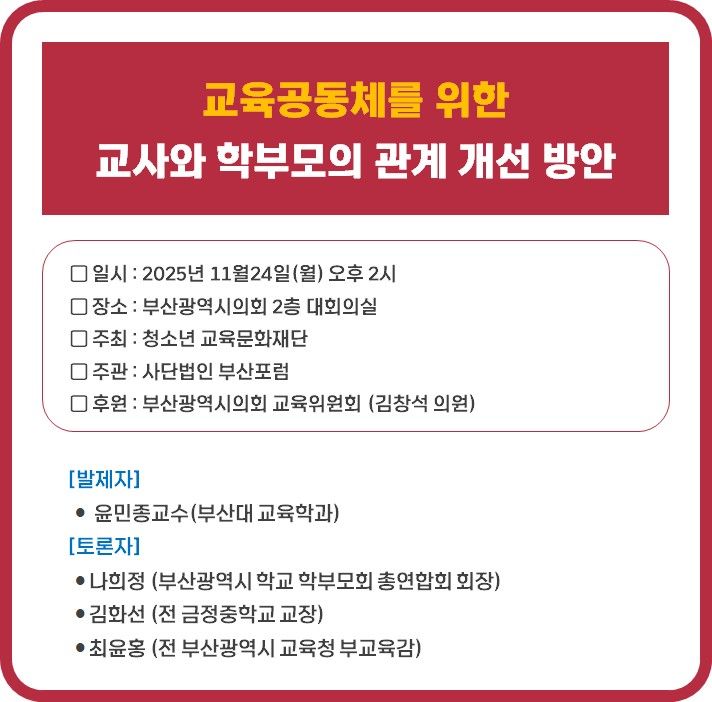 교사의 교권과 학부모 민원을 둘러싼 갈등이 끊이지 않는 가운데 ‘교육공동체를 위한 교사·학부모 관계 개선 방안 토론회’가 24일 부산시의회 대회의실에서 열린다. 이번 토론회는 청소년교육문화재단이 주최하고 (사)부산포럼이 주관, 부산시의회 교육위원회가 후원한다.