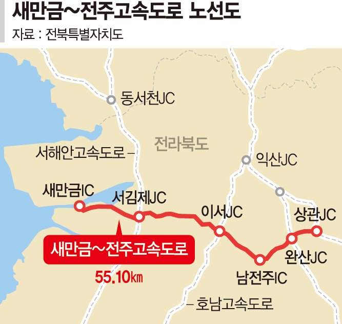 해당 고속도로는 김제 새만금 지역에서 완주 상관까지 이어지는 55.1㎞ 길이다. 서해안 관문 새만금과 전북 중심인 전주 간 이동시간이 기존 76분에서 33분으로 43분(57%) 단축됐다. 주행거리와 차량 운행 비용 절감, 교통사고 감소 등 연간 2018억원의 경제적 편익이 예상된다.