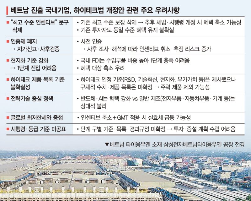 2008년 제정된 하이테크법은 베트남의 첨단 제조·정보기술(IT)·연구개발(R&D) 유치를 가능하게 한 법적 근간으로, 국내 기업들의 대규모 베트남 투자 결정을 가능하게 했던 핵심 축이었다. 그러나 이번에 추진하는 개정안은 법 제4조에 명시된 '최고 수준의 인센티브 제공' 문구를 삭제하면서 국내 기업들의 불안감이 고조되고 있다. 베트남 진출 국내 기업들은 '최고 수준의 인센티브 제공'를 근거로 대규모 투자를 계속해왔지만 이와 관련한 문구를 삭제하는 것을 비롯해 인센티브 부여 방식의 변화, 등급 세분화에 따른 인센티브 차등화, 하이테크 기술 범주 변화 등 베트남 정부가 개정을 넘어선 사실상 구조적 재설계에 나섰다는 평가다. 업계에서는 '사실상 장기적인 투자가 어렵다'는 목소리도 나오고 있다.