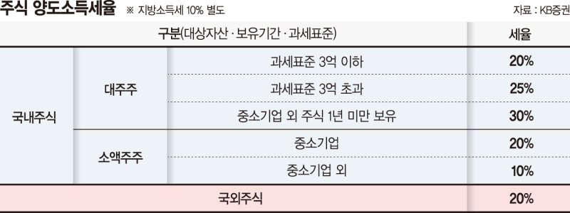 23일 KB증권에 따르면 해외주식은 국내주식과 달리 소액주주여도 매매차익에 양도소득세를 내야 하는 구조다. 1년간 발생한 매매 손익에서 250만원을 공제한 금액에 22% 세율(지방소득세 포함)을 적용해 내년 5월 말까지 양도소득세를 신고 및 납부해야 한다.