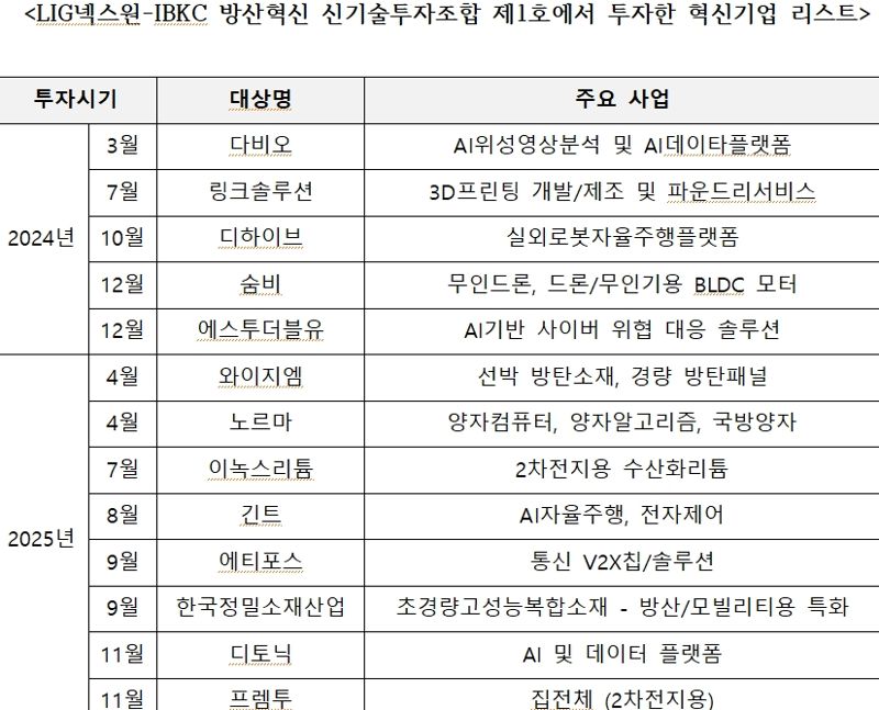 이 펀드는 AI(인공지능) 기반 위성영상분석 기술 기업 ‘다비오(Dabeeo)’를 시작으로 방산·우주·항공·로봇 부품을 3D프린팅으로 제조하는 ’링크솔루션‘ 등에 투자했다. 올해 말까지 군집자율비행기술, 국방AI, AI Surveillance 등 다수 테크기업 대상으로 130억원 규모의 추가 투자 집행이 예정돼 있다.