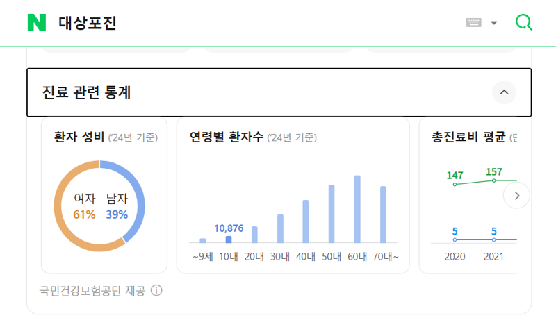 가령 네이버 검색창에 '고혈압'을 입력하면 해당 질병에 대한 임상 정보와 함께 전 국민 의료이용 정보를 토대로 산출된 환자수(연령대별 진료실인원, 환자 성비), 진료비(1인당 연간 외래·입원별 총진료비 평균 및 범위) 통계 정보를 손쉽게 조회할 수 있다.