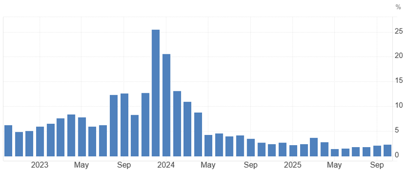 아르헨티나의 소비자물가지수(CPI)는 밀레이 대통령이 취임했던 지난 2023년 12월 전월 대비 25.5%였으나 지난달에는 2.3%을 보이고 있다.