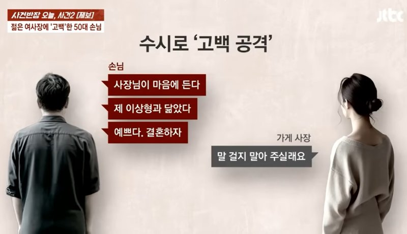 문제는 그 이후였다. 제보자는 "손님이 주기적으로 바 테이블에 자리를 잡고 '사장님 마음에 든다', '내 이상형과 닮았다', '결혼하자'는 식의 고백을 계속했다"고 말했다.