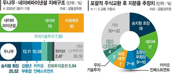 네이버파이낸셜은 모회사인 네이버가 70%의 지분을 보유해 통과가 수월할 전망이다. 업계에서는 두나무의 기업가치를 14조~15조원, 네이버파이낸셜을 4조7000억~5조원으로 추산돼 교환비율 3대 1이 유력한 것으로 보고 있다. 30% 지분을 갖고 있는 미래에셋 측이 네이버파이낸셜 기업가치가 저평가됐다고 불만을 제기했으나, 합병안에 찬성한 것으로 알려졌다.