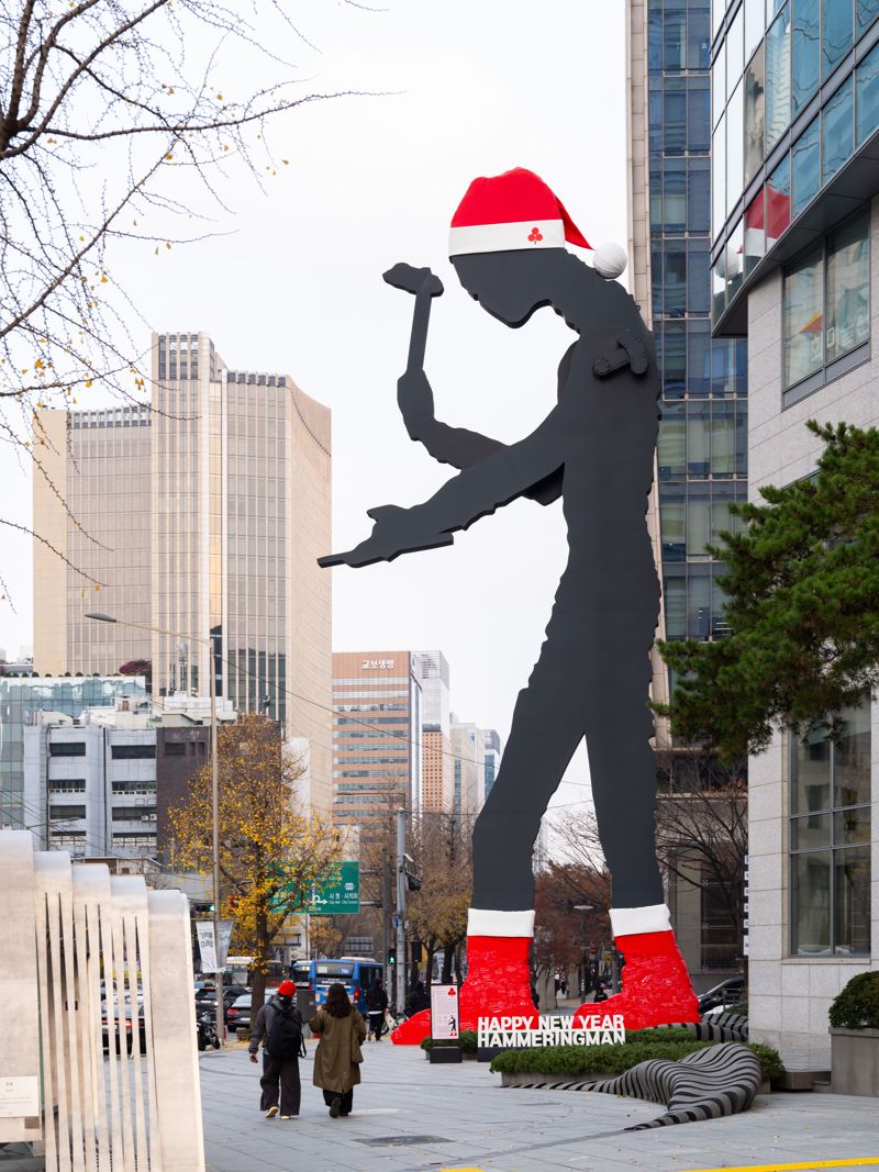 ‘해머링맨’은 광화문 흥국생명빌딩 외벽에 설치된 높이 22m의 대형 조형물로, 미국 조각가 조나단 보로프스키가 제작한 연작 작품이다. 뉴욕, 프랑크푸르트, 나고야 등 전 세계 11개 도시에도 같은 연작이 설치돼 있으며 광화문 작품이 그 중 가장 큰 규모다.