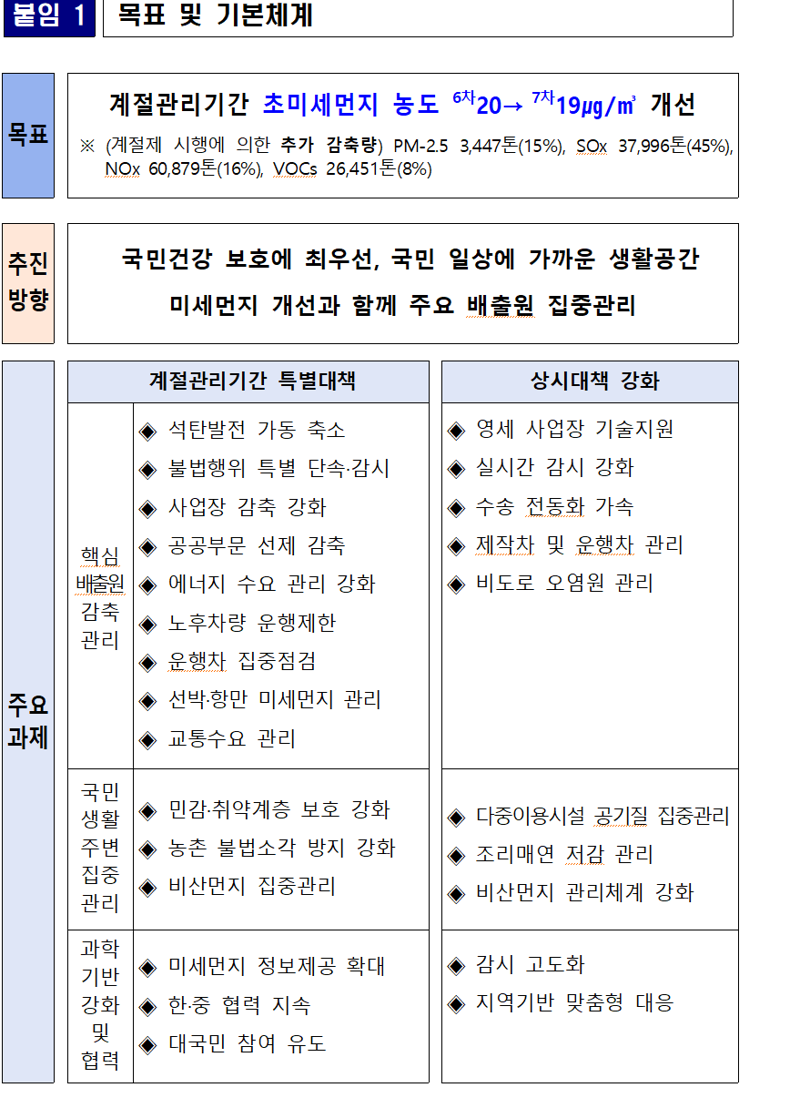 대외 협력도 강화된다. 정부는 9월 한중 환경장관회의 이후 후속 조치로 지난달 공동연구 워크숍을 열었고, 지난 21일에는 계절관리제 사전교류 회의를 진행했다. 현재는 하루 한 차례 이상 예보 정보를 교환하고 있으며, 필요할 경우 장관급 화상회의 등 고위급 소통도 추진할 계획이다.